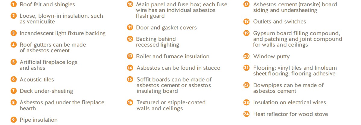 Until the early 1980s, many products containing asbestos were used in house construction. Some products, such as asbestos containing vermiculite insulation, were used in homes right up until the late 1980s. The drawing in this pamphlet shows many possible sources of asbestos in older homes. When you are renovating or demolishing an older house, there is a high probability of encountering asbestos-containing materials. If asbestos-containing materials are in good condition and left intact, they do not pose a significant danger of releasing asbestos fibres into the air you breathe. However, these materials are hazardous when they deteriorate or are disturbed, such as when they are handled, sanded, drilled into, or broken up so that they crumble. To avoid disturbing asbestos-containing materials, you must know where they are before you begin renovations. We can give you the assistance you need to get rid of this hazardous substance without endangering your health if you are starting a demolition or building project that involves it. We can oversee your project to neutralize the danger. We help identify and neutralize the danger before you start.
